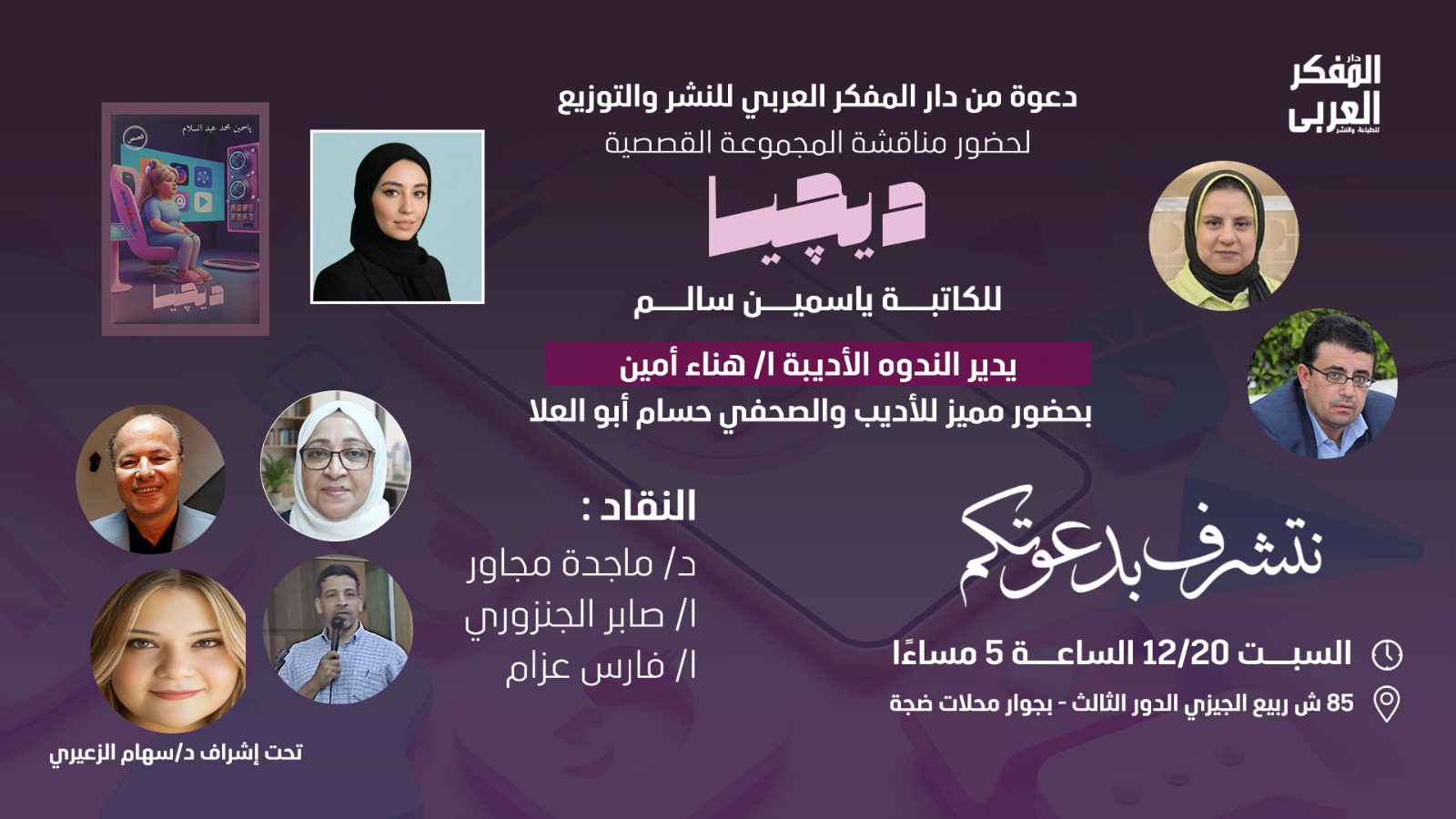 يستضيف دار ومنتدى المفكر العربي، مساء السبت المقبل الموافق 20 ديسمبر، أمسية أدبية لمناقشة المجموعة القصصية «ديچيا» للكاتبة ياسمين سالم، وذلك بمشاركة نخبة من الأدباء والكتاب والمفكرين والمثقفين والإعلاميين.