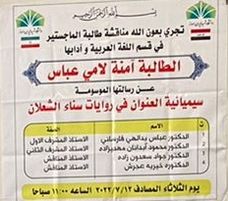 ناقشت الباحثة آمنة لامي عبّاس رسالتها الماجستير بعنوان “سيميائيّة العنوان في روايات سناء كامل الشّعلان” في قسم اللّغة العربيّة وآدابها في كليّة الإلهيّات والمعارف الإسلاميّة في جامعة شهيد تشمران أهواز إيران استكمالاً لمتطلبات الحصول على درجة الماجستير في فرع اللّغة العربيّة.