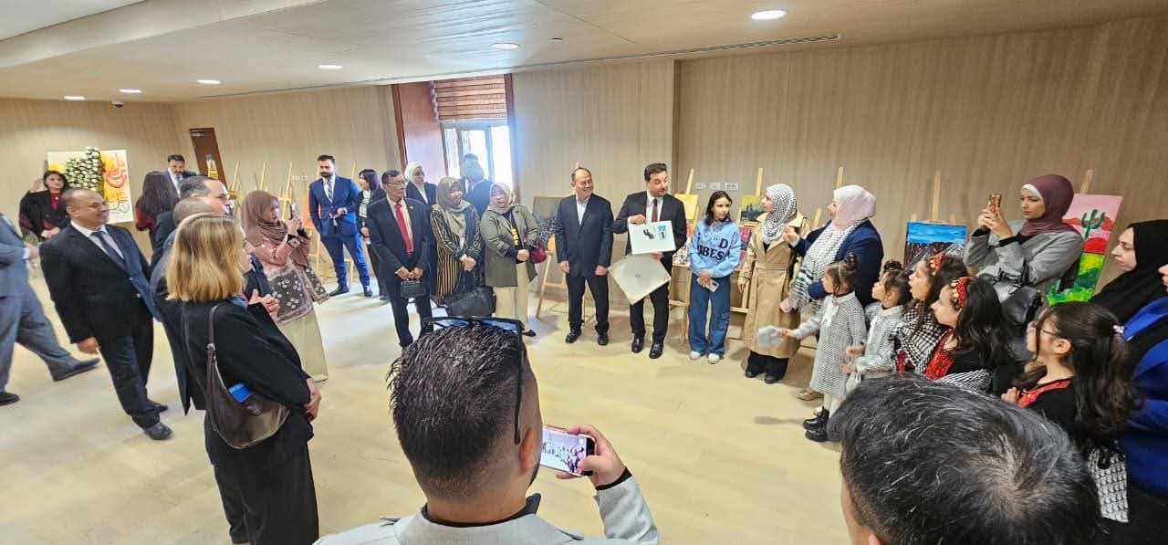وأقيم على هامش فعاليات اليوم معرضا فنيا تضمن رسومات الأطفال الناجين من الحرب ذوي الشهداء والجرحى والمصابين المتواجدين في مصر ، والذي أبهر الكادر الدبلوماسي بالرسائل التى تعكسها لوحات الأطفال ومأساتهم الشخصية والوطنية وما لاقوه من قتل وقصف ونزوح وتدمير وسلب الأمن والأمان والاستقرار من حياتهم ووطنهم .